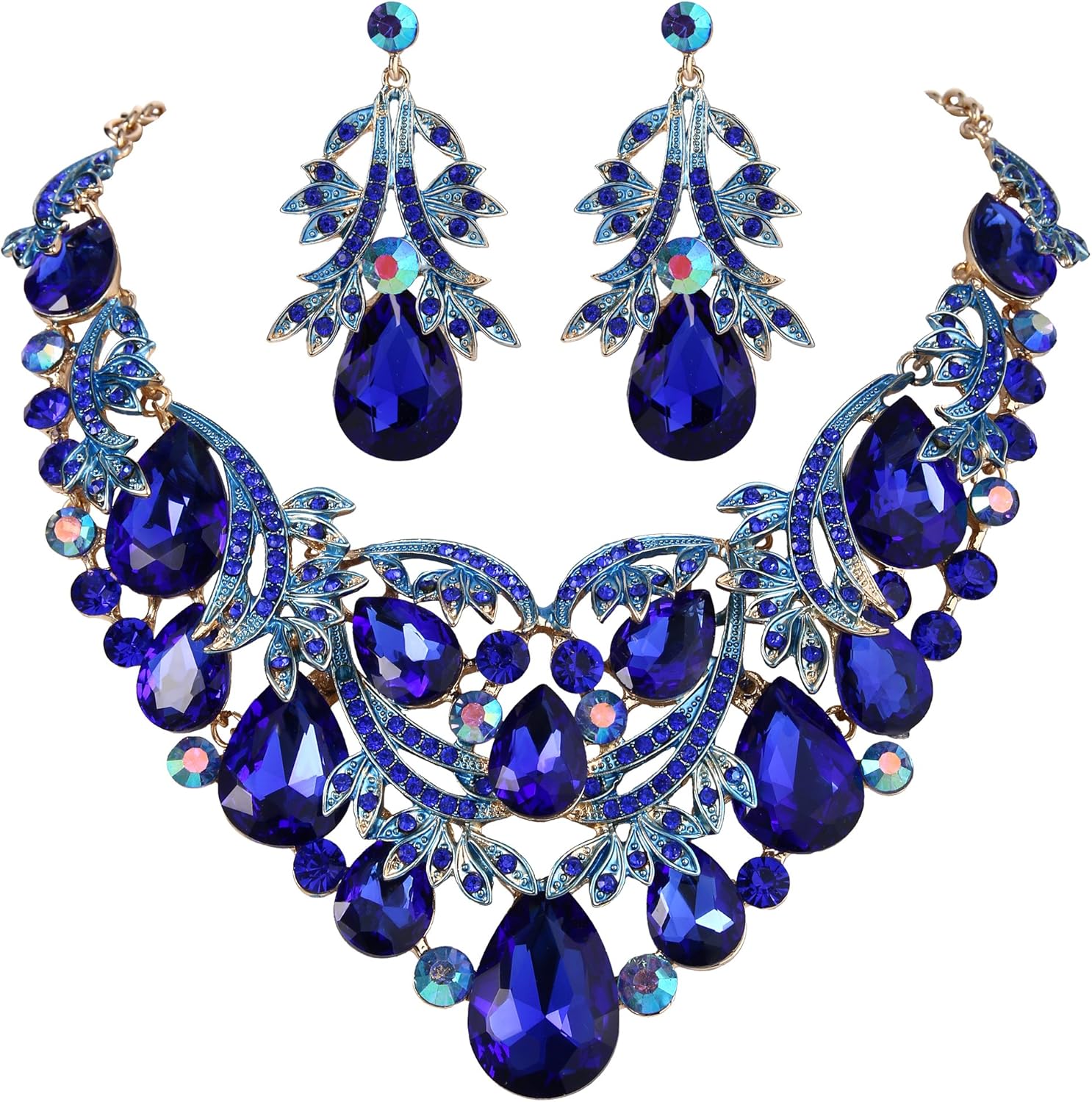 BriLove Women's Bohemian Boho Crystal Teardrop Filigree Leaf Hollow Statement Necklace Dangle Earrings Set