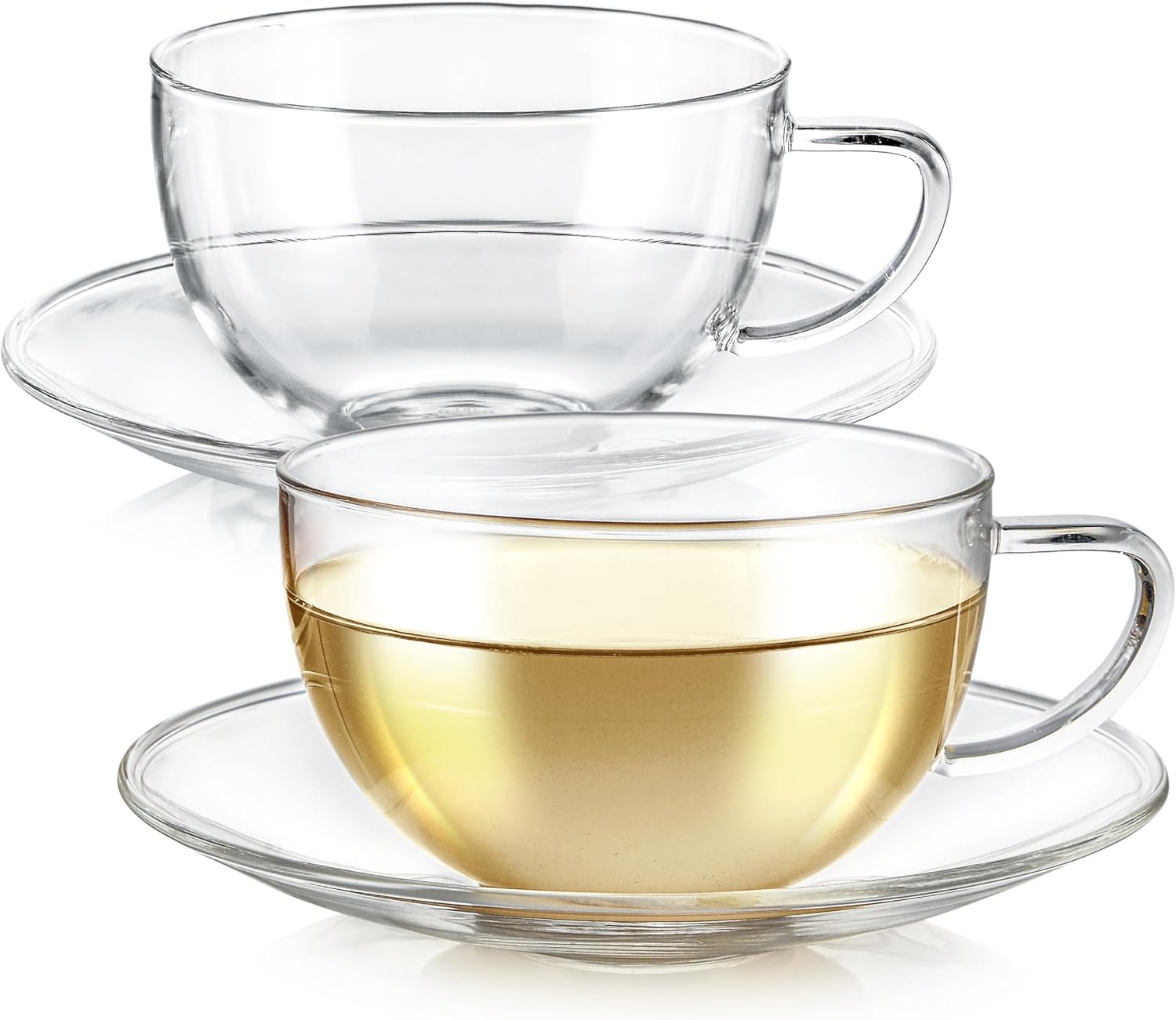 Teabloom Kyoto Teacup and Saucer Set 2-Pack – Large Size – 12 OZ/ 350 ML Capacity – Crystal Clear Design –– Premium Borosilicate Glass – Heat Resistant, Microwave Safe – Glass Mug Set