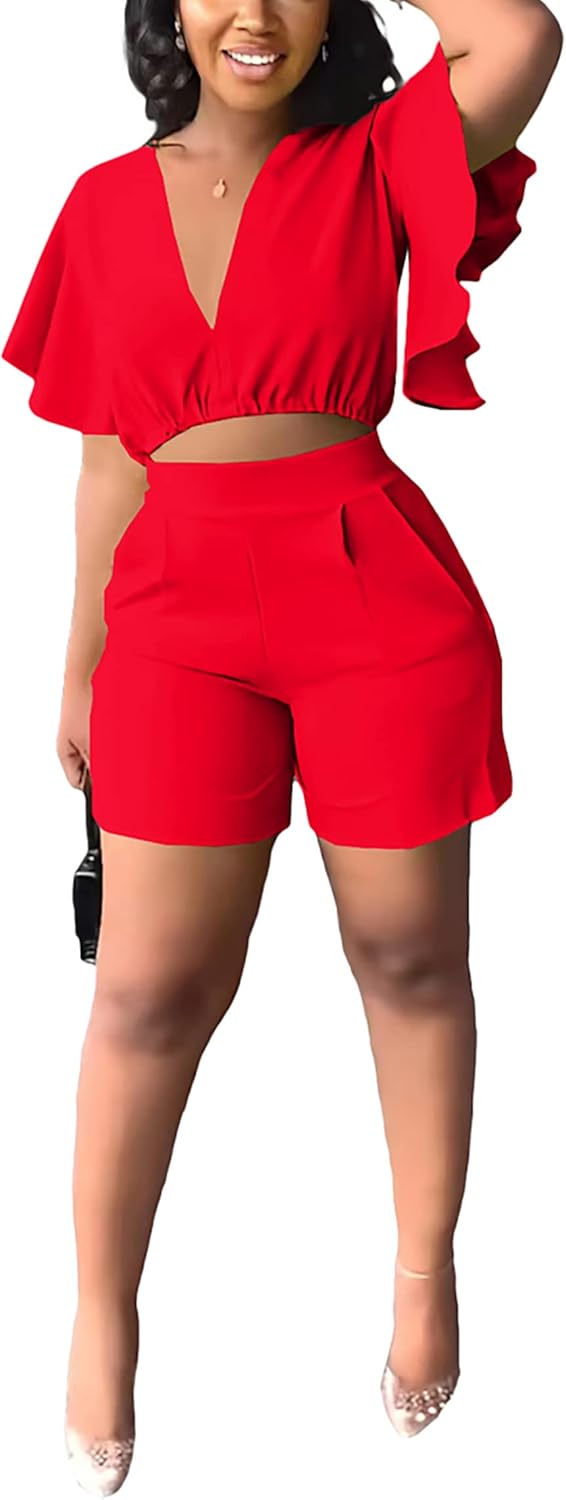 Fooullaide Womens Summer 2 Piece Outfit Set Crop Top Butterfly Sleeve Short Set Sexy Beach Vacation 2pc Sets