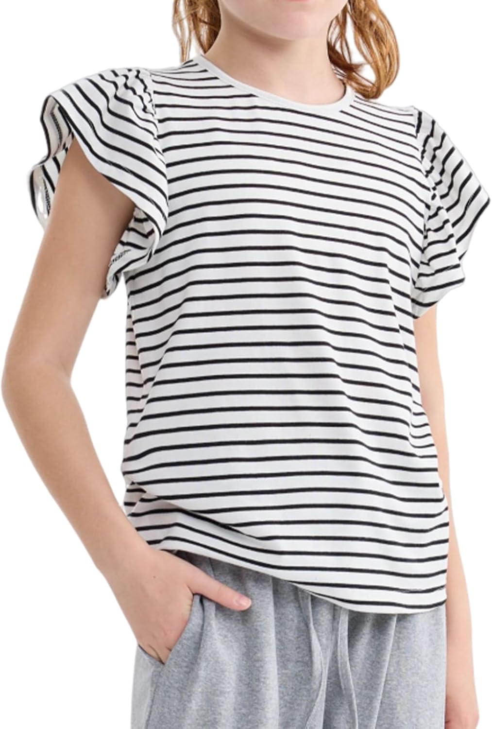 Girls Summer Shirts Kids Striped Ruffle Sleeve T Shirts Crew Neck Casual Tops Cute Short Sleeve Tees 5-14 Years