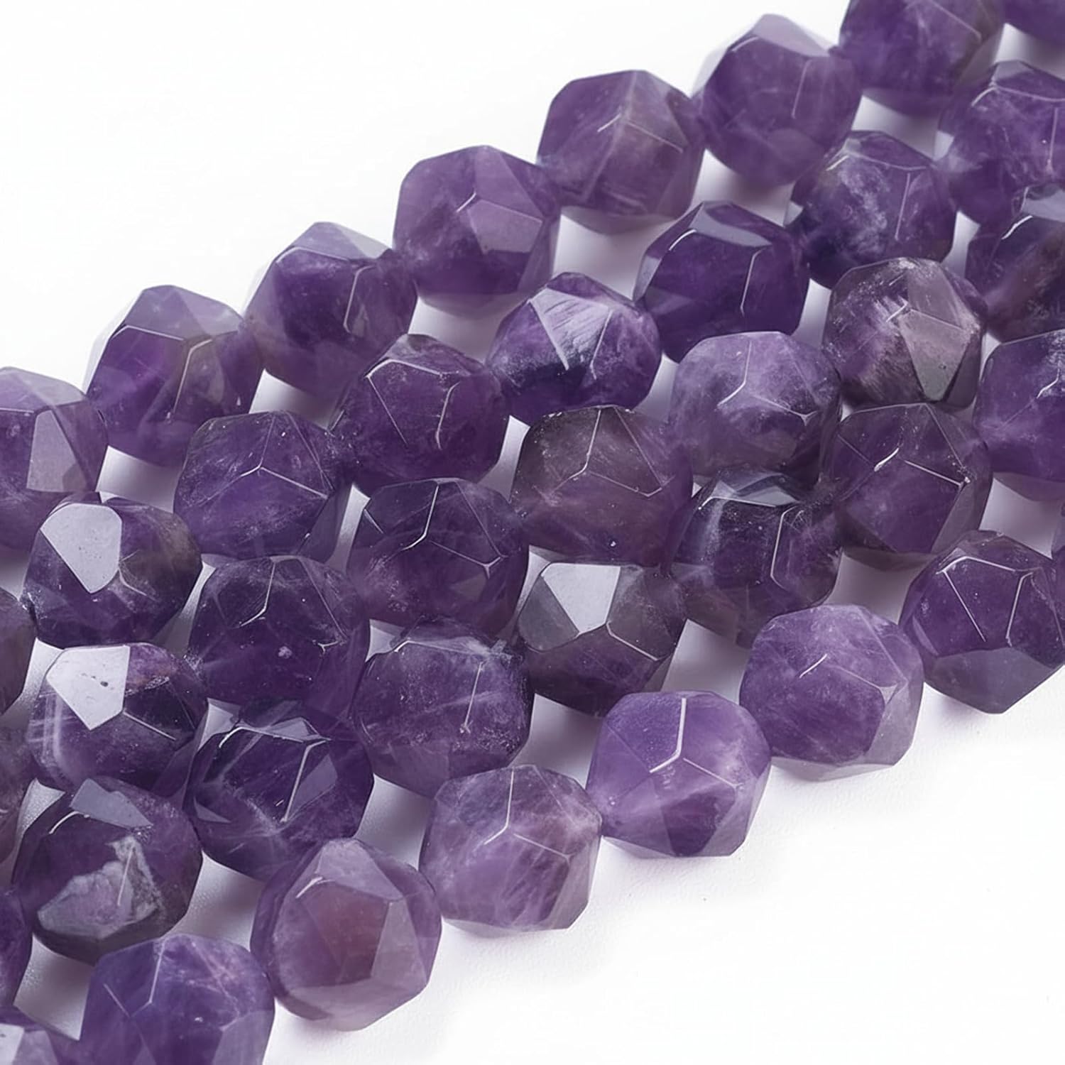 Fashewelry 10mm Natural Amethyst Gemstone Faceted Polygon Crystal Energy Stone Healing Chakra Star Cut Round Spacer Beads for Jewelry Craft Making, 7.8" (About 18pcs)
