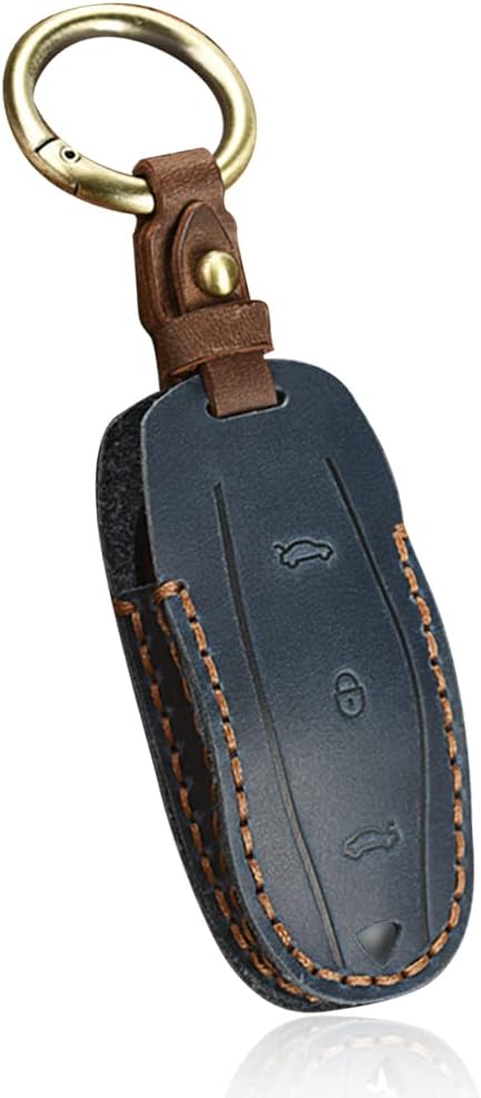 HIBEYO New Luxury Genuine Leather Car Key Fob Case Cover fit for Tesla Model X Model S Model 3 with Keychain Smart Key Shell Holder Accessories 3 Button-Bule