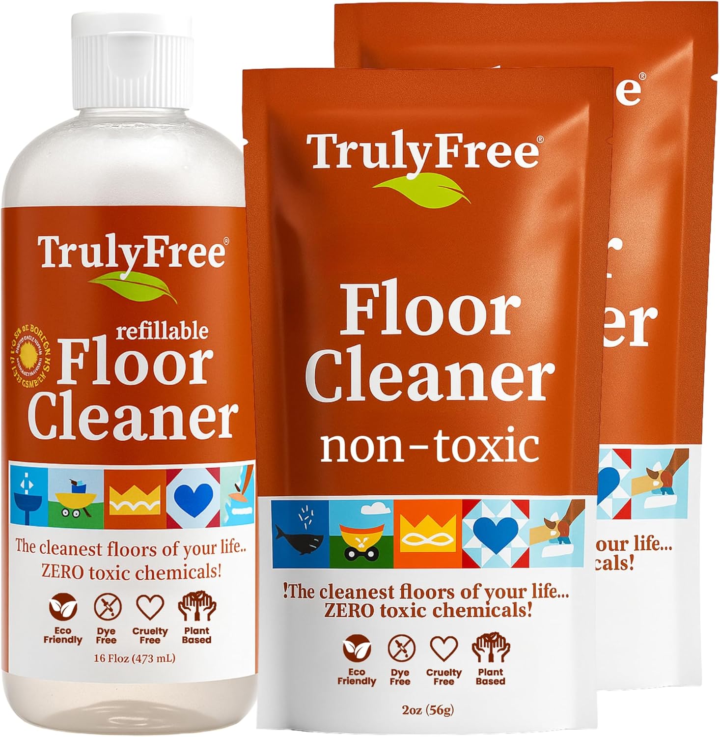 Truly Free Floor Cleaner Kit - Plant-Based Mopping Solution (16oz Reusable Empty Bottle + Two Pouches, 3oz ea.) - DIY All-Surface Cleaner for Hardwood, Tile, Wood & Concrete