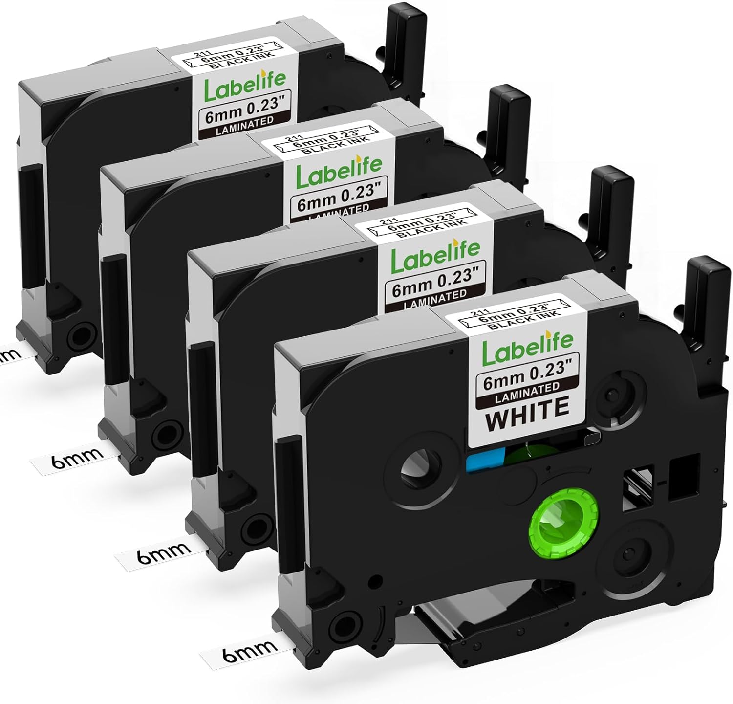 Labelife Replacement for Brother TZe-211 TZe211 P Touch Label Tape 6mm Label Maker Tape TZe TZ Tape 6mm 0.23 Laminated White for Brother PT-D220 PT-D210 PT-H110 PT-D400 PT-D600, 0.23 Inch, 4-Pack