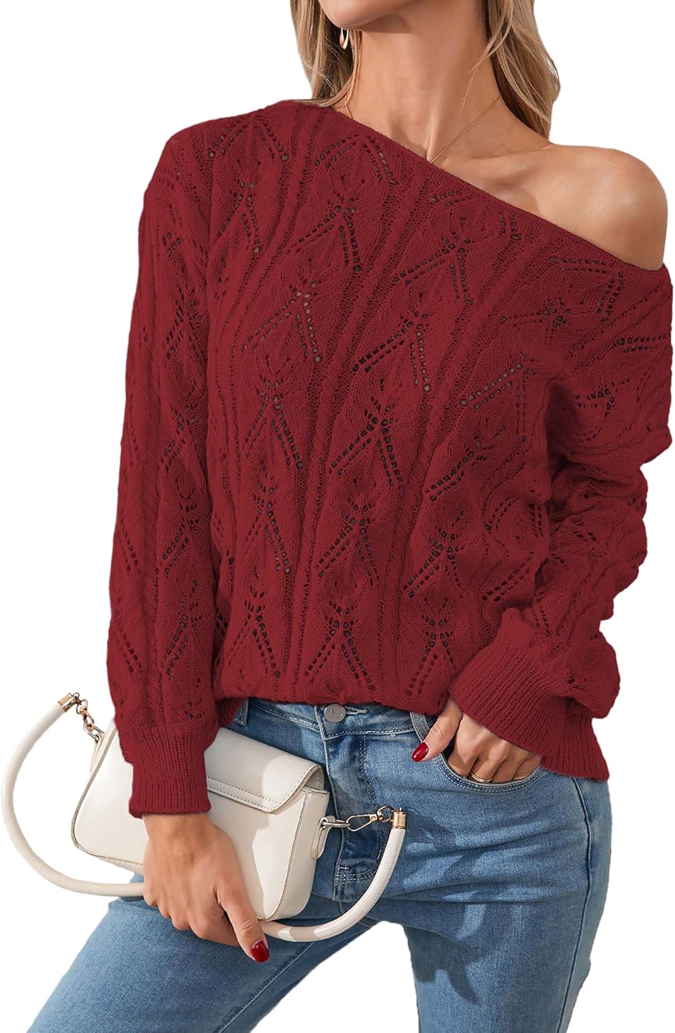 Womens Cute Sexy Off The Shoulder Crochet Knit Sweater Fall Winter 2025 Trendy Lightweight Boat Neck Pullover Top