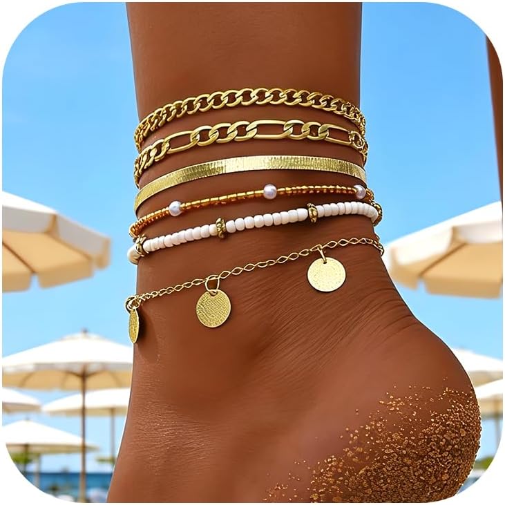 FAXHION Gold Anklet Set for Women, Layered Ankle Bracelets with Beads & Shell Charms, Adjustable Beach Foot Jewelry Ankle Bracelet for Summer Vacation