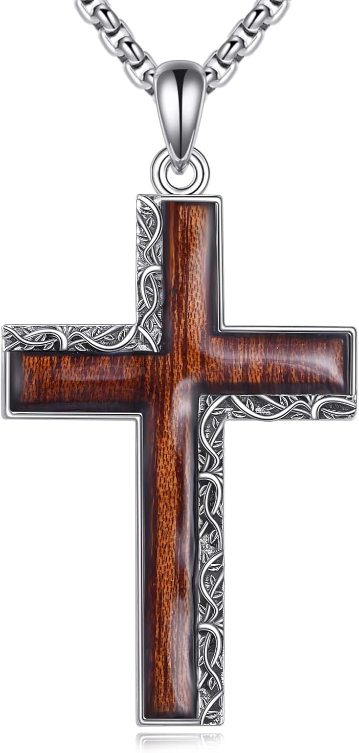 YAFEINI Wood Cross Necklace Sterling Silver Tree of Life Necklace Wood Cross Tree of Life Jewelry Gifts for Men