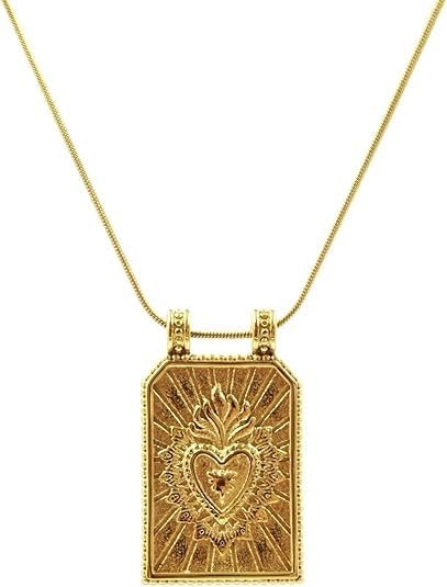 18k Gold Plated Vintage Heart Necklace, Stainless Steel Tag Pendant with Sunburst Design, Boho Tarot Inspired Layering Jewelry for Women
