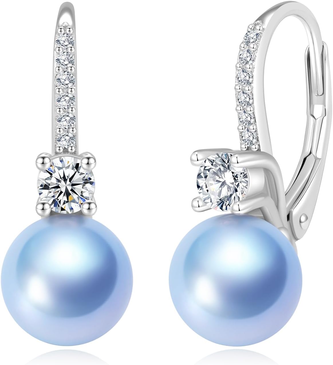 Pearl Drop Dangle Earrings 925 Sterling Silver Cubic Zirconia Leverback Earrings, 8MM Round White/Black/Blue Cultured Pearls Jewelry Gifts for Women Wife Mother