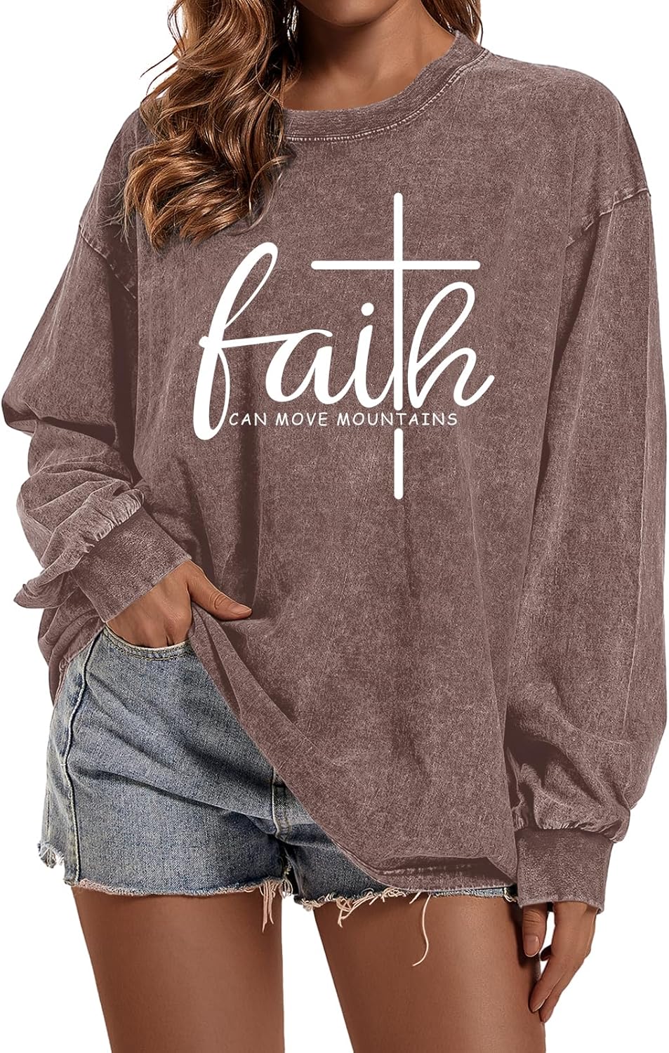 Christian Shirts for Women Faith Can Move Mountains Acid Wash Shirt Jesus Religious Bible Verse Long Sleeve Top