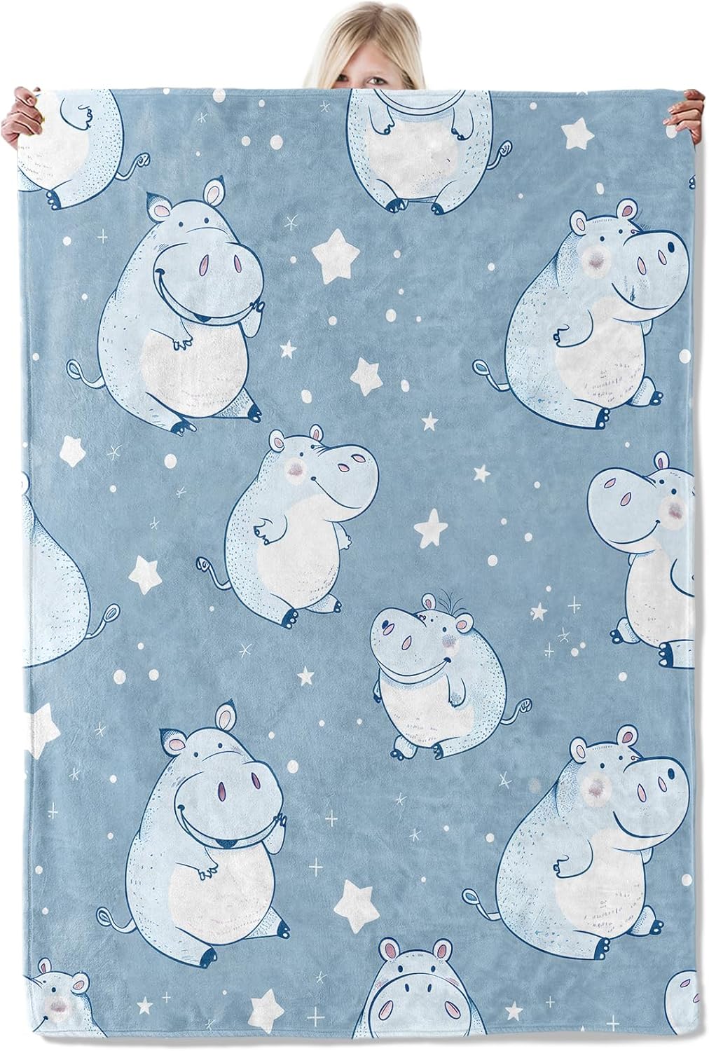 Cute Hippo Blanket 50×60 Inch,Adorable Cartoon Hippos and Stars Lightweight Flannel Throw with Blue Background, Home Living Room Decor,Gifts for Kids,Animal Lovers