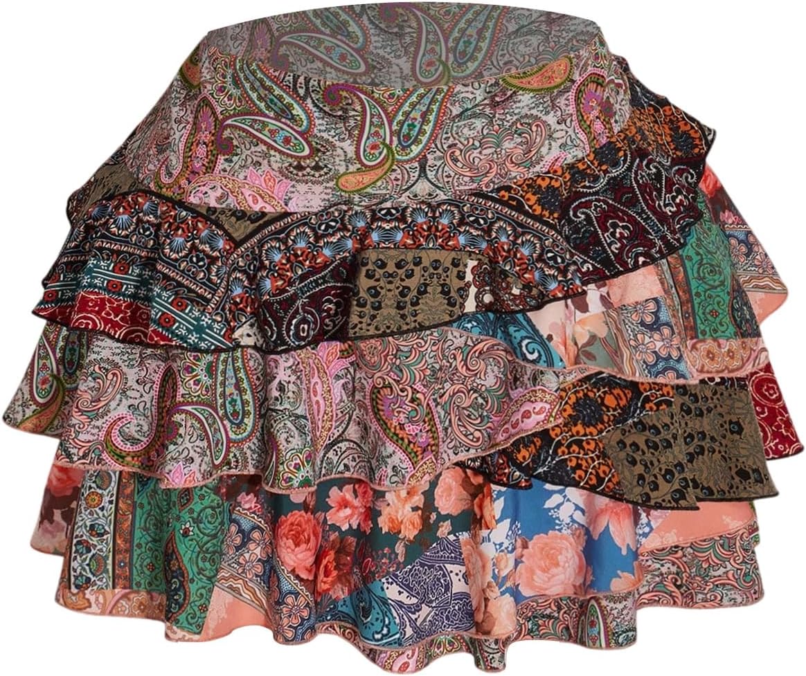 OYOANGLE Women's Plus Size Patchwork Printed Layered Ruffle Short Skirt High Waisted A Line Boho Western Skirts