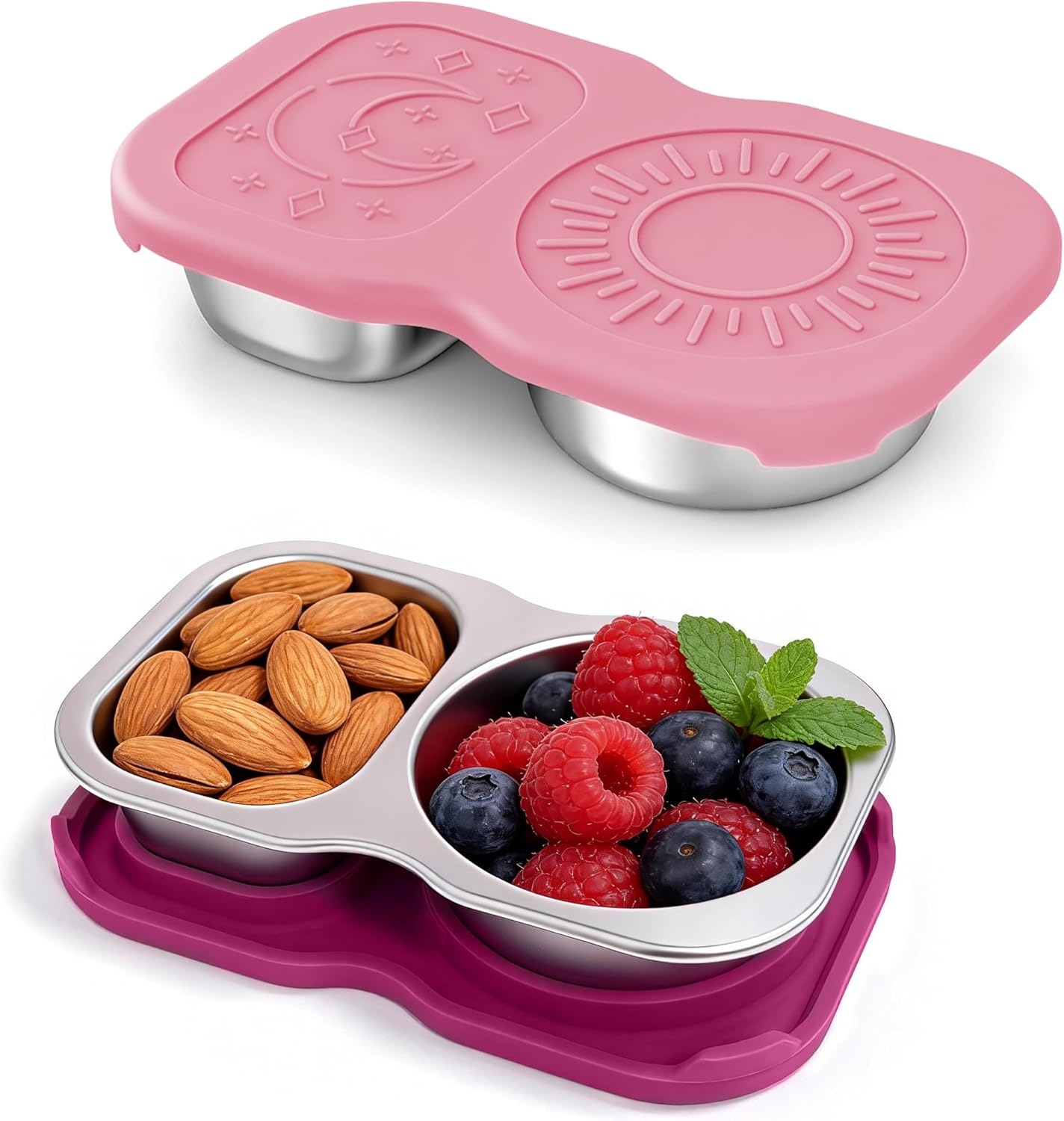 QCQHDU Snack Containers, 2-Compartment Small Stainless Steel Reusable Snack Boxes for Portion Control, Meal Prep Lunch Food Sauce Storage Lunchable Accessories Salad Dressing Containers to Go, 2 Pack