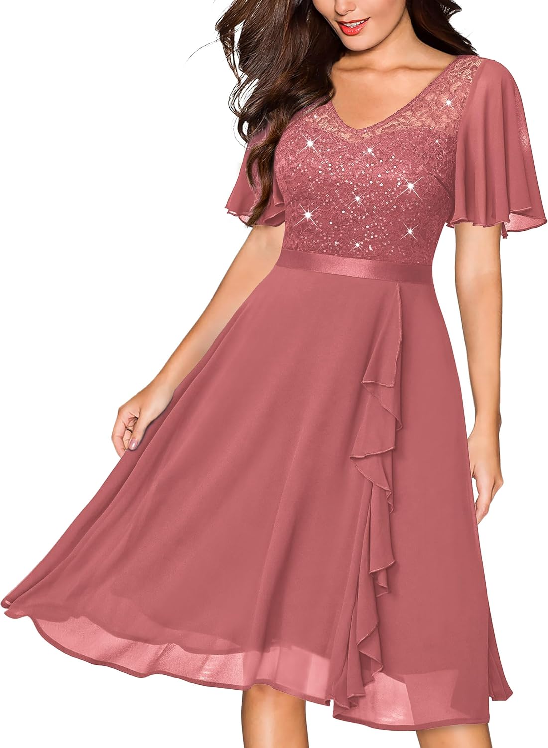 Miusol Women's Sequin Lace V Neck Ruffle Style Cocktail Party Chiffon A-line Dress