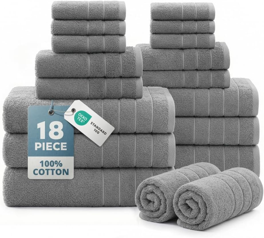 Casa Platino Cotton Towels Set for Bathroom - 18 Pc Family Pack - Super Soft & Quick Dry - 6 Bath, 6 Washcloth, 6 Hand Towels - Oeko TEX Certified, Machine Washable & Durable - Cool Grey