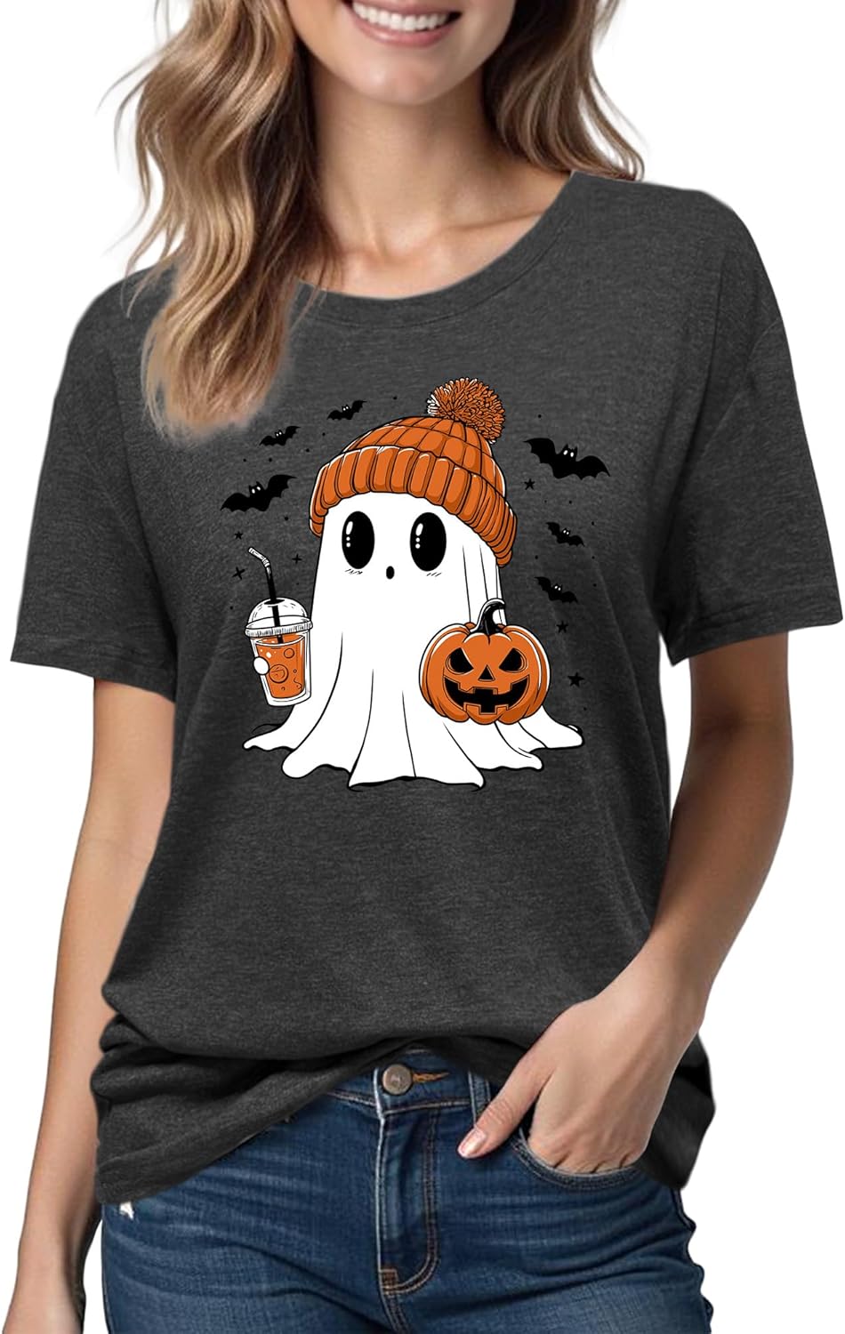 Halloween Shirts for Women: Pumpkin Ghost Print Funny Crewneck Short Sleeve Top for Costumes Autumn Party Graphic T-Shirt