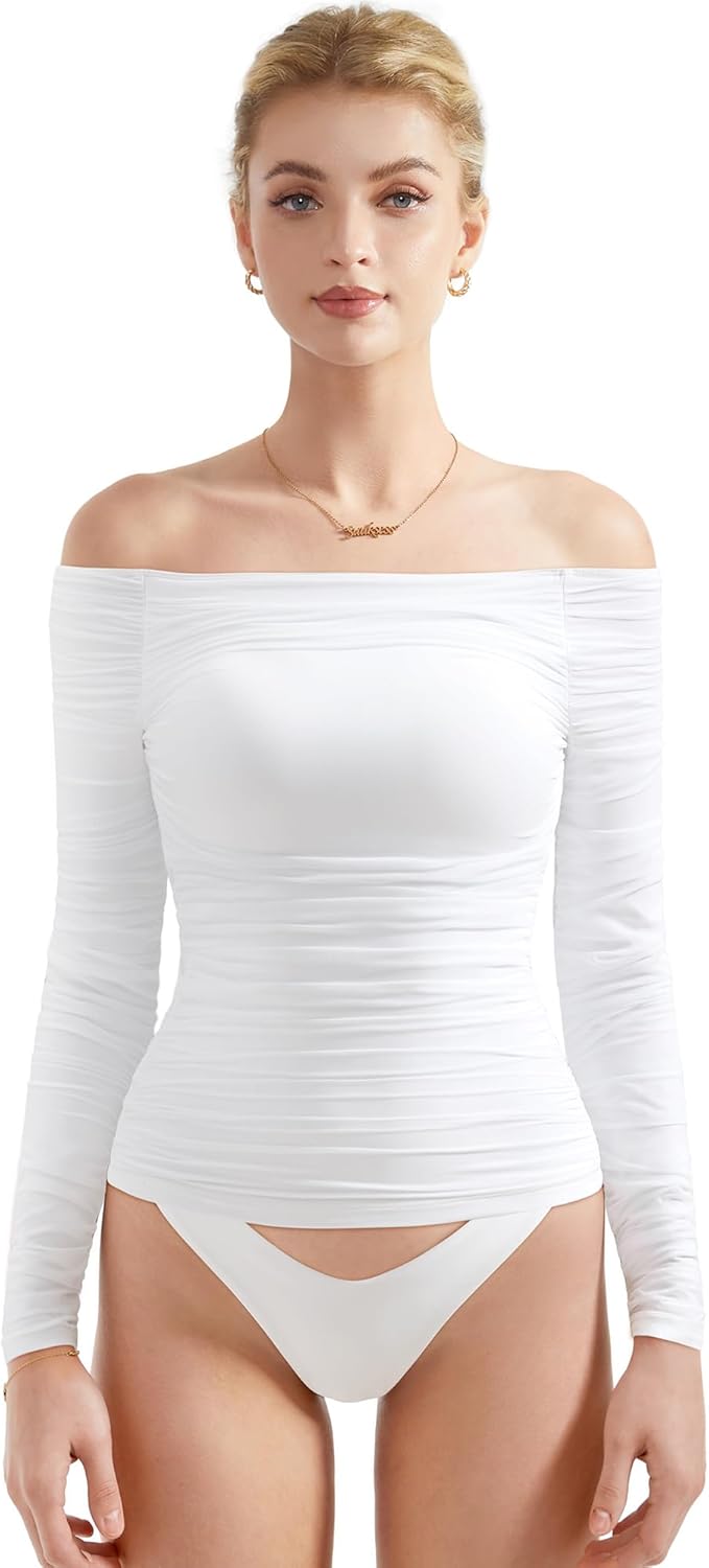 SUUKSESS Women Double Line Mesh Padded Tops Off The Shoulder Long Sleeve Shirts