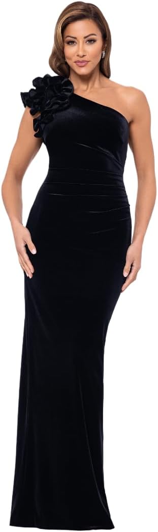 Xscape Women's Long One-Shoulder Velvet Dress with Ruffle Shoulder and Center Back Zipper, Black, 10