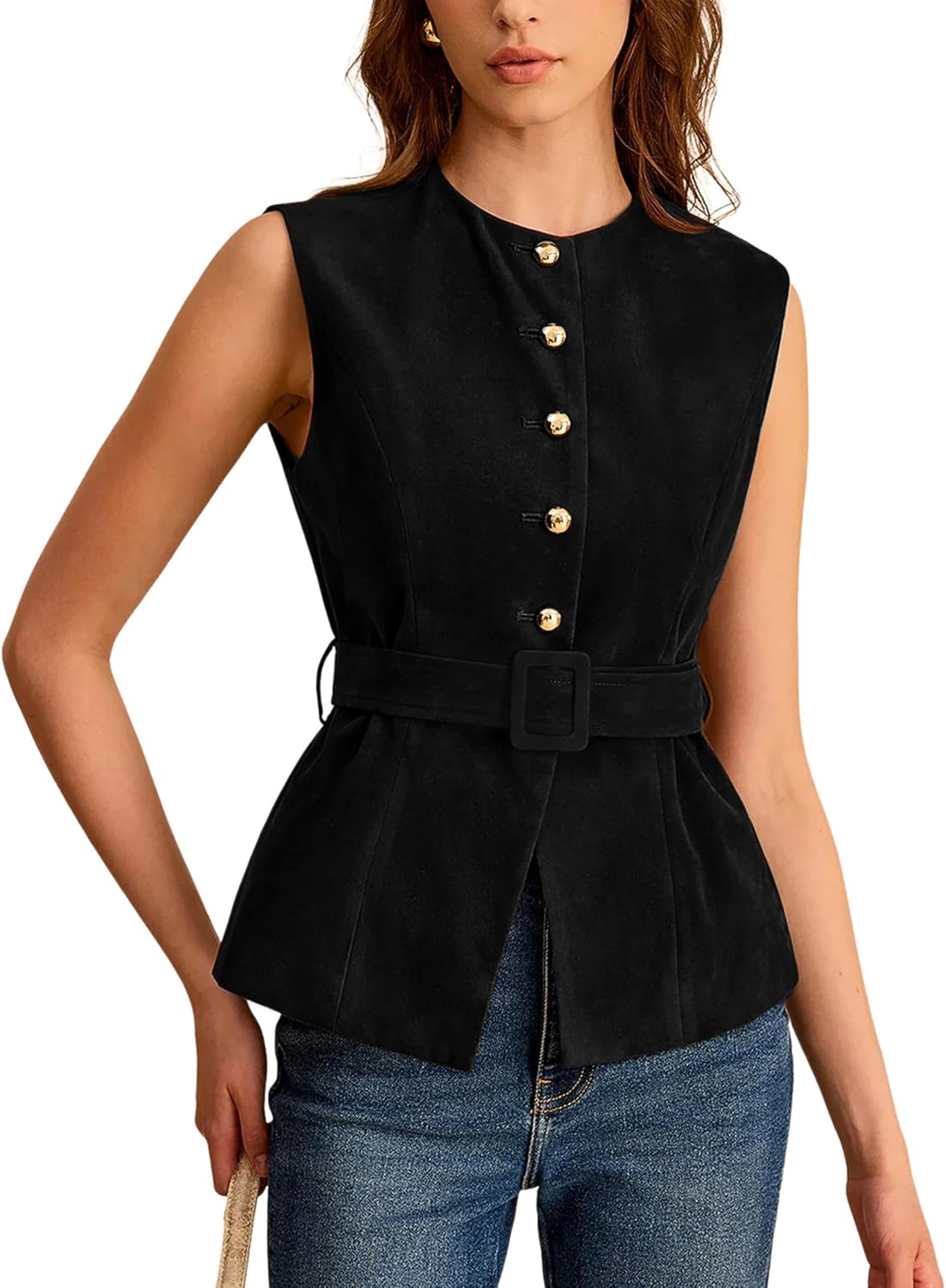 Lentta Womens Suede Vest Crew Neck Sleeveless Button Down Dressy Suit Waistcoat with Belt