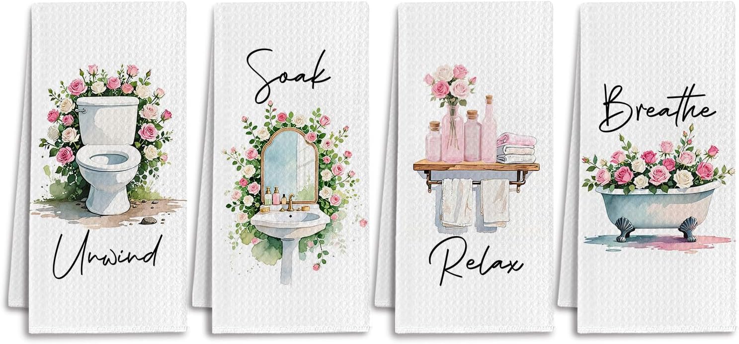 Pink and White Rose Decor Bathroom Hand Towels, Rustic Rose Flower Botanical Breathe Unwind Soak Relax Decorative Hand Towel for Bathroom Washroom Spa Gym, 16x24 Inch Set of 4