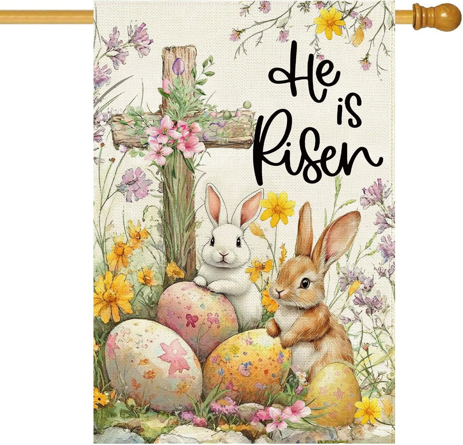 - Weatherproof & Well Made: The upgraded heavy 2 layers fabrics both printed, plus super strong sewing made, as well the premium dyestuff, makes the Cross bunny eggs floral yard flags can stand the long season winds, rains or snows, still keep persistent, colorful, vibrant, bright and active