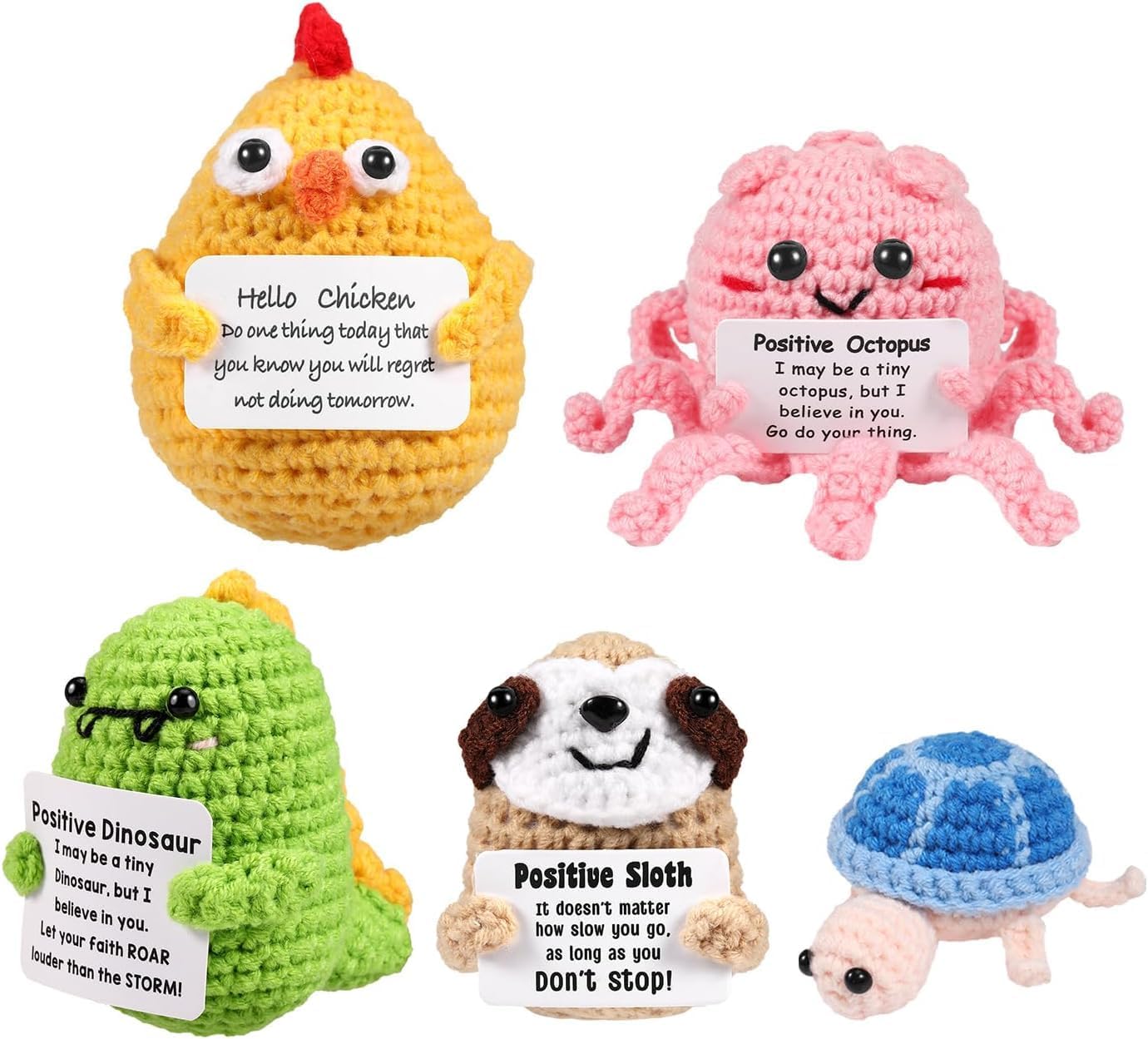 - Emotional Support Crochet Dolls: You will get 5pcs cute crochet positive dolls: positive chicken, positive dinosaur, positive octopus, positive tortoise and positive sloth - to bring a smile to your face and provide comfort when needed.