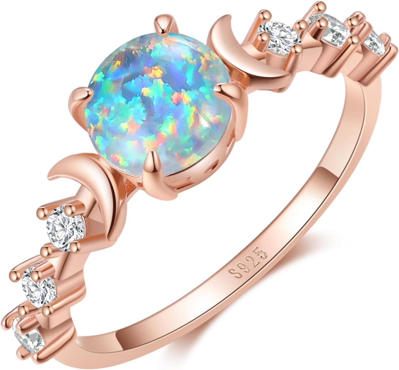 Natural Moonstone Ring for Women, 925 Sterling Silver Triple Moon Goddess Engagement Promise Ring for Anniversary, Birthday, Christmas, Valentine's Day Gift for Her (Opal-Rose Gold, 11)