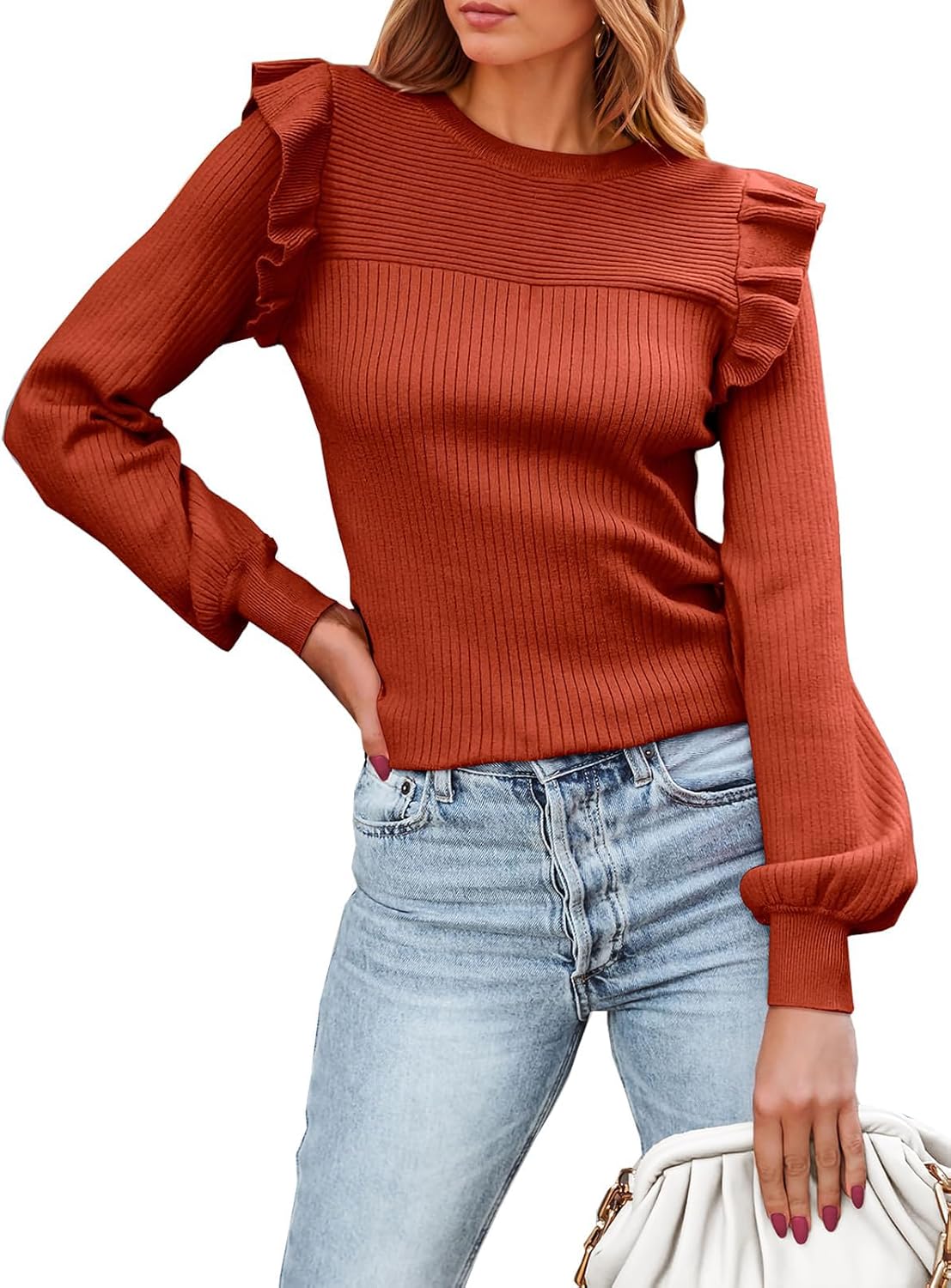 PRETTYGARDEN Women's Ruffle Long Sleeve Sweaters Crew Neck Lightweight Sweater 2026 Fall Trendy Ribbed Knit Pullover Tops