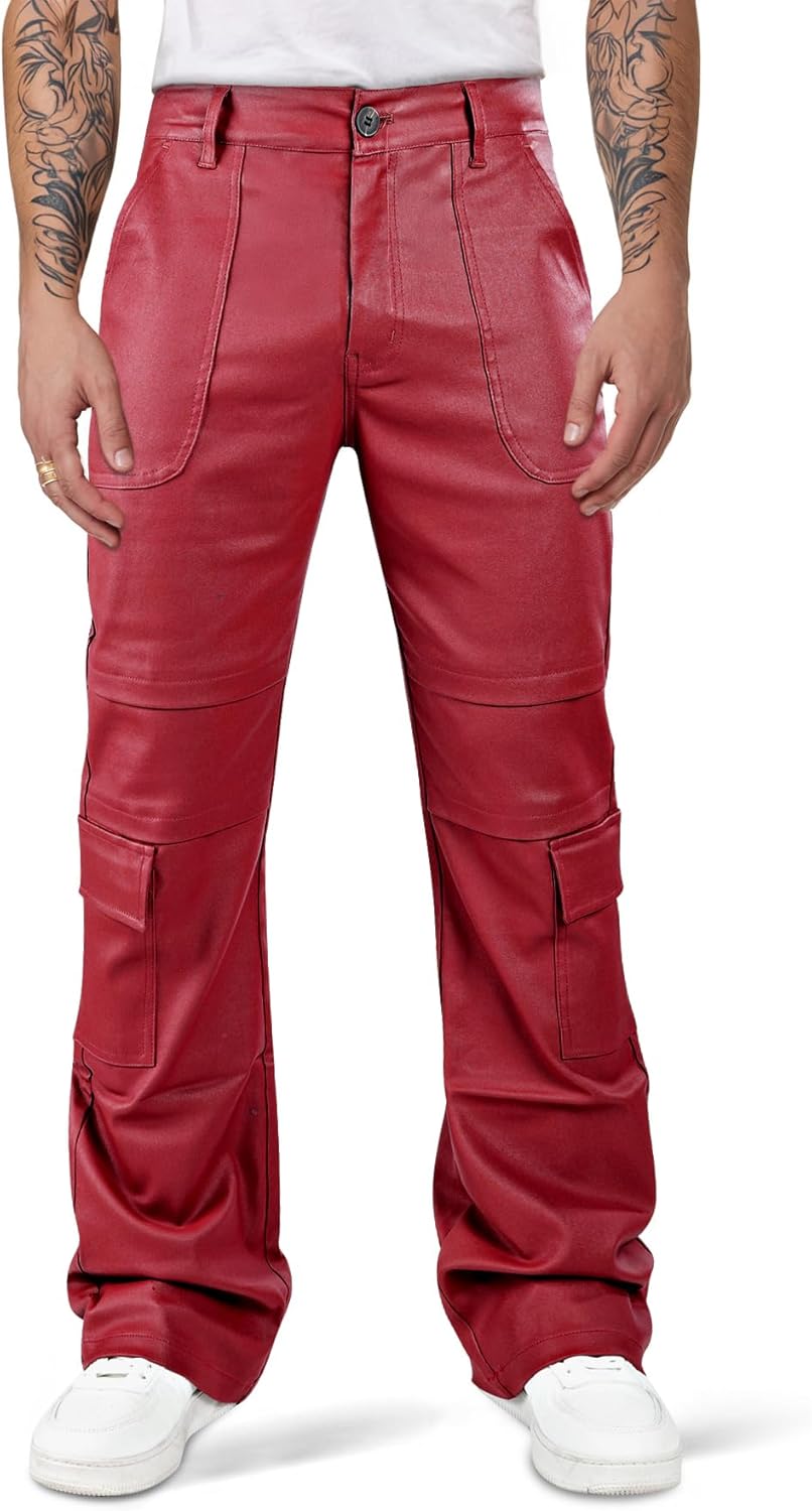GINGTTO Mens Faux Leather Cargo Pants Flared Bell Bottoms with Pockets for Men 70s Party Pants