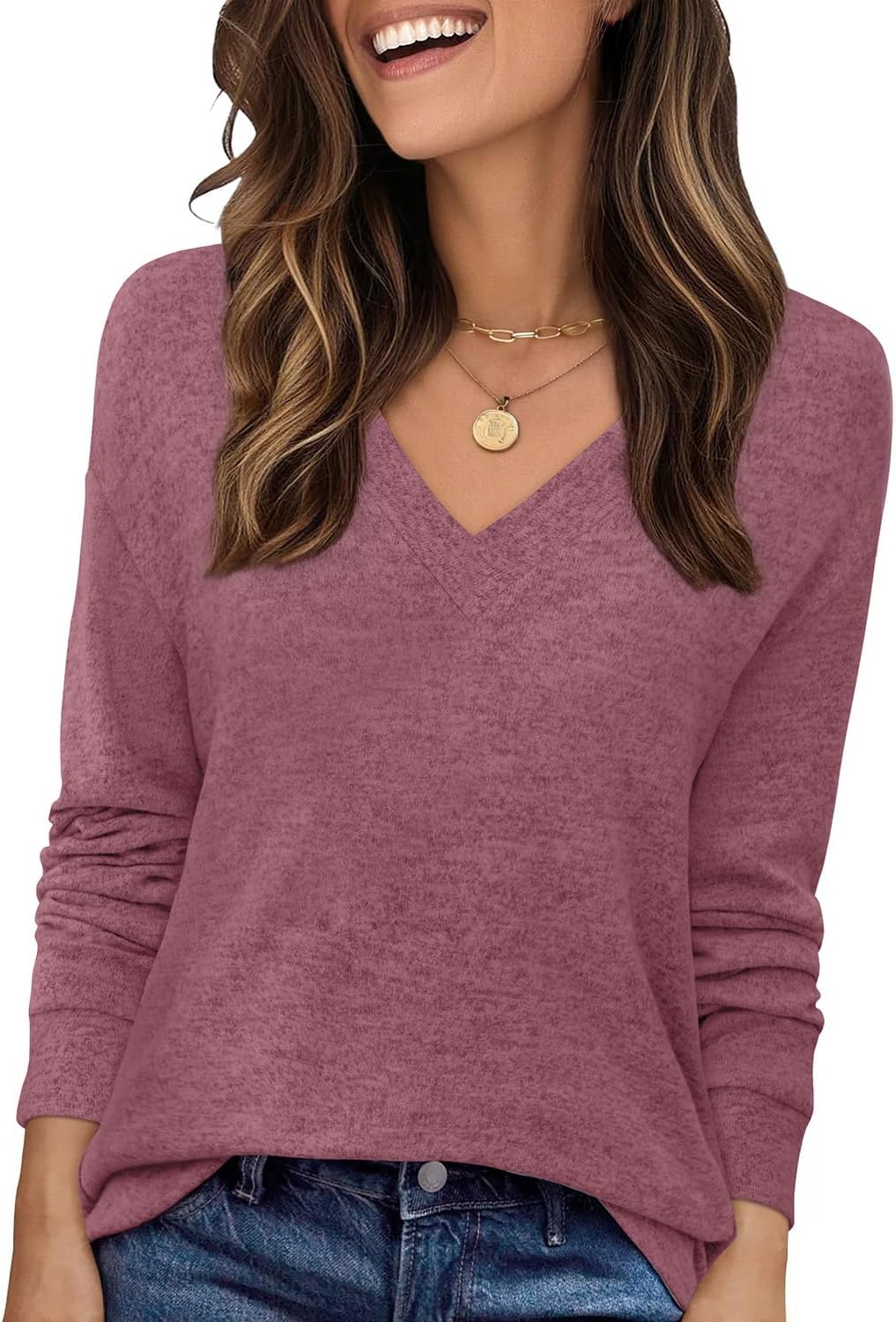 JUSTFASHIONNOW Long Sleeve Shirts for Women V Neck Tops Tunic Dressy Casual Blouses Comfy Tee Womens Top Winter Clothes 2025