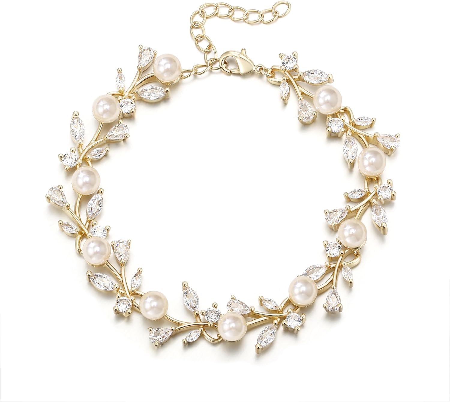 EVER FAITH Gorgeous Cubic Zirconia Wedding Link Bracelet for Bride Bridesmaids, Simulated Pearl Clear Marquise Teardrop Crystal Bridal Jewelry for Women Prom
