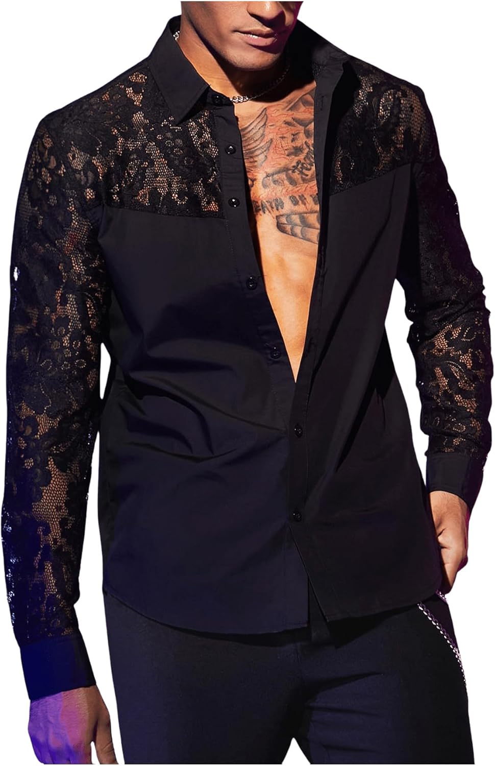 WDIRARA Men's Floral Lace Button Down Shirt See Through Long Sleeve Collared Top Sexy Clubwear