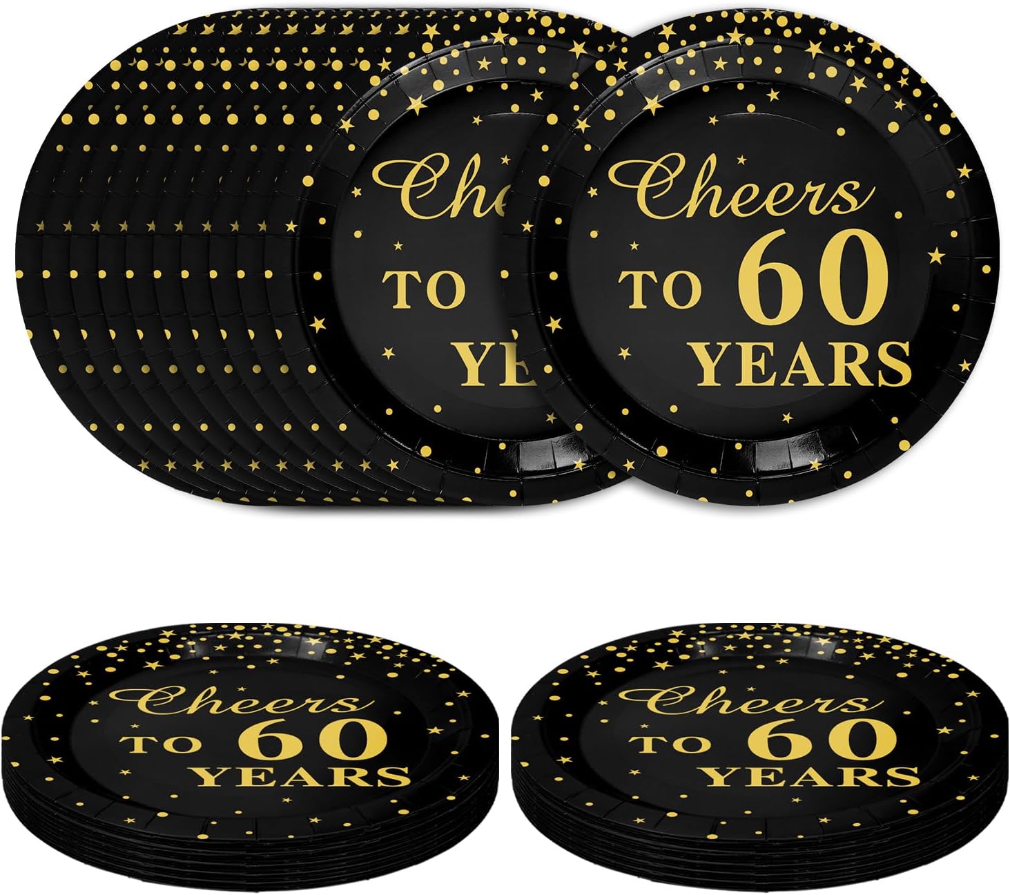 - Party plates: The cheers to 60th years plates create a fashionable and festive party atmosphere and can be used for various table settings. Using black and gold paper plates at your party will add more beautiful colors to your party