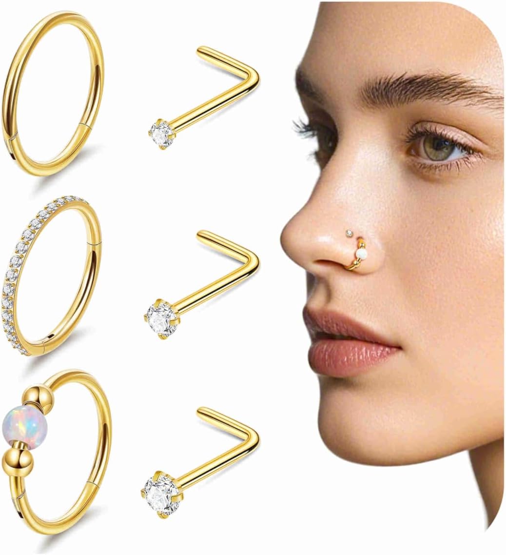 6PCS 18G 20G Surgical Steel Nose Ring for Women Men Clicker Hoop Nose Rings CZ L Shaped Nose Stud Hinged Septum Nose Hoop Cartilage Conch Rook Ring Lip Tragus Piercing Jewelry 7-9MM