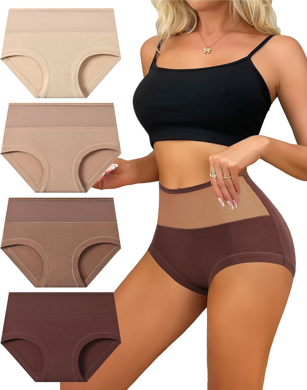 Women's Cotton High Waisted Underwear, Transparent Mesh Stretch Briefs, Full Coverage Ladies Panties 4 Pack