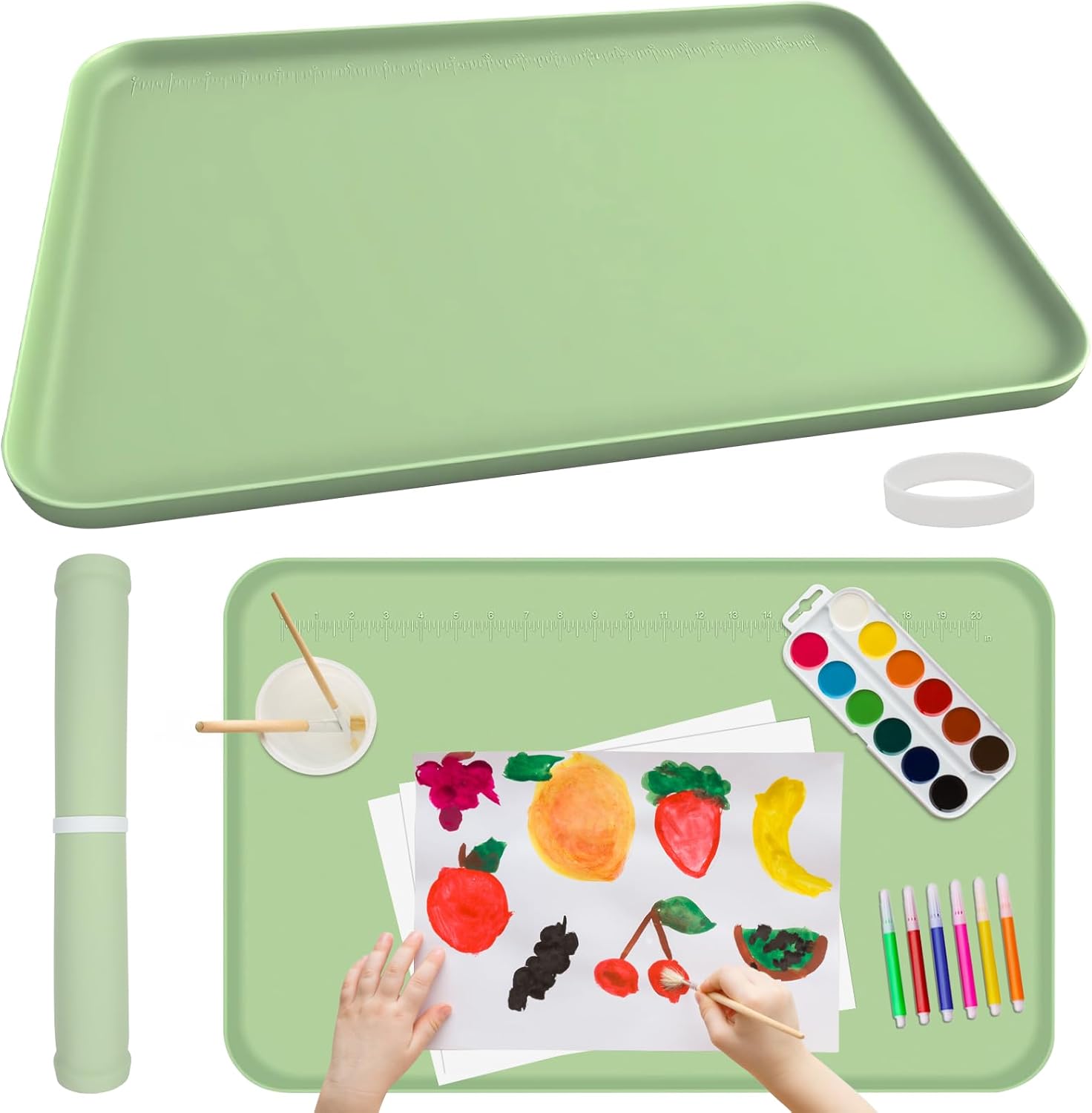 Silicone Art Mat for Painting, 24"x16" Green Roll Up Craft Mat with Raised Edges, Non-Slip Surface Protector