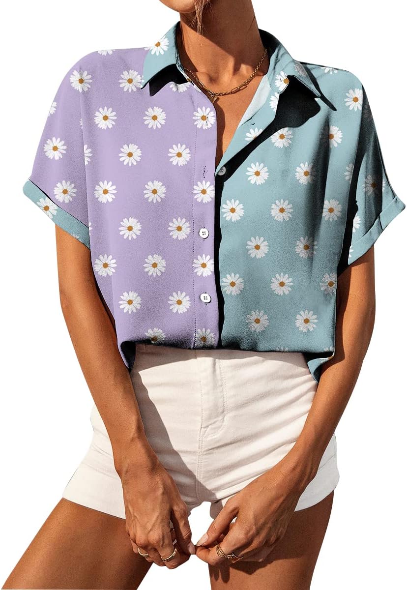 Selene Women's Summer Casual Short Sleeve V Neck Collared Button Down Shirt Cute Vintage Print Blouse Tops