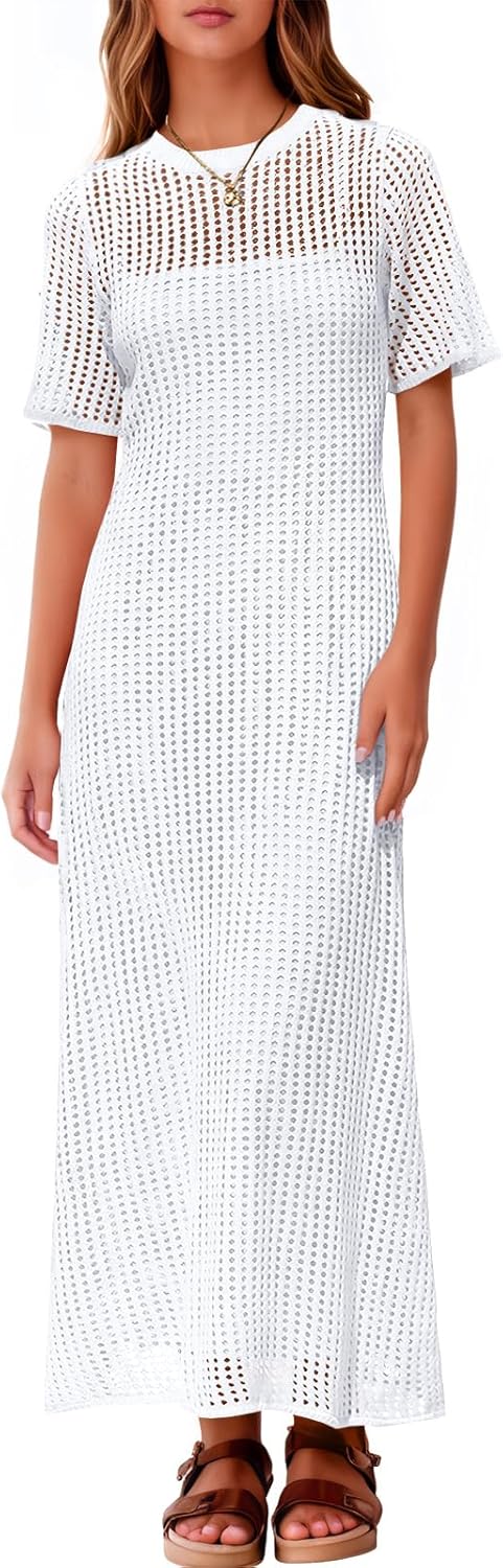 Fisoew Womens Crochet Swimsuit Cover Up Summer Vacation Resort Bathing Suit Swimwear Casual Short Sleeve Maxi Beach Dresses