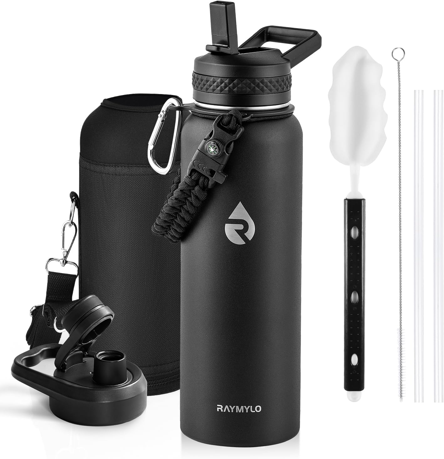 - What You'll Get: We offer Continuous After-sales Service and 100% customer satisfaction against any leakage or insulation failure. You purchase contains: RAYMYLO Water Bottle, Carrying Pouch, Straw Lid with 2 Straws & Straw Brush, Spout Lid, Paracord Handle, Bottle Brush