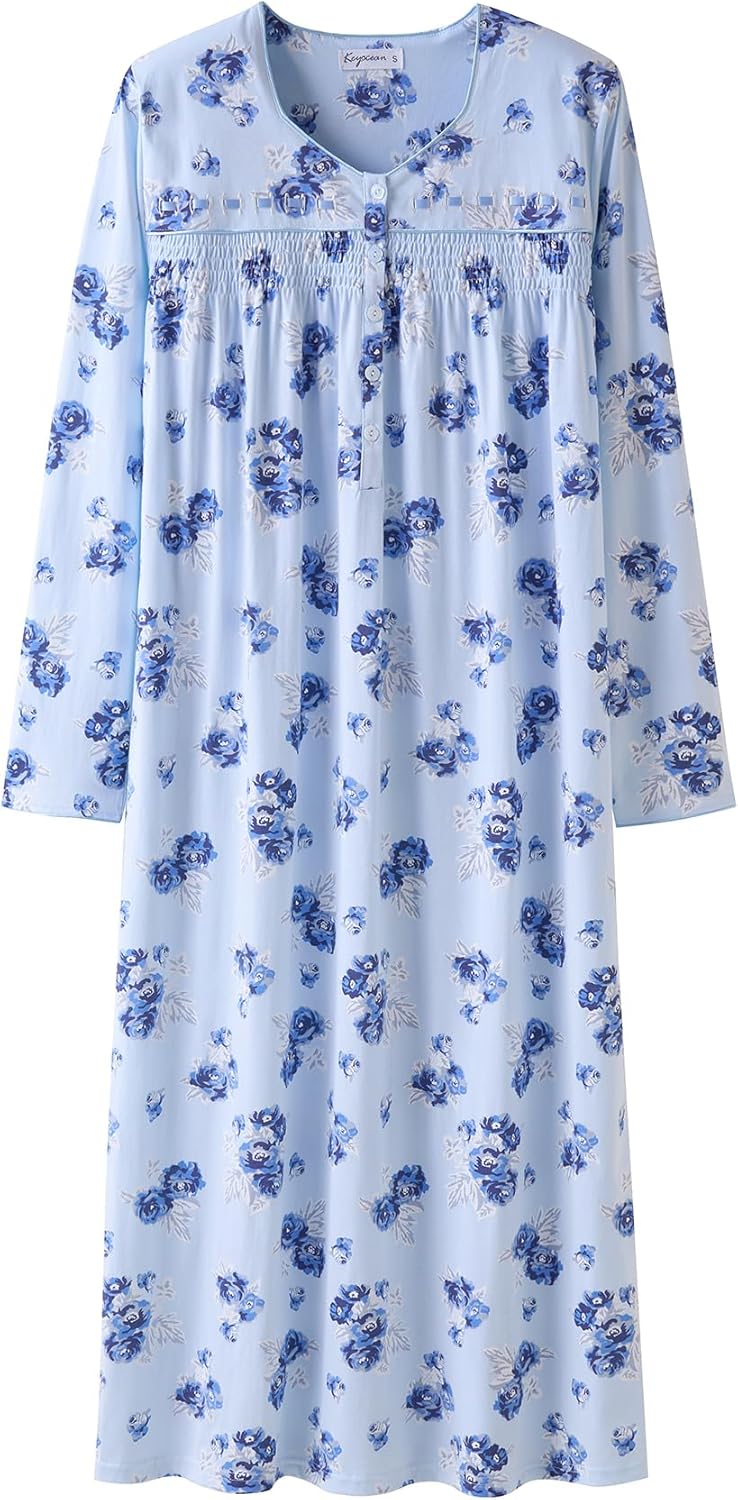 Keyocean Nightgowns for Women, Soft Cotton Comfy Lightweight Embroidered Long-sleeve Nightdress