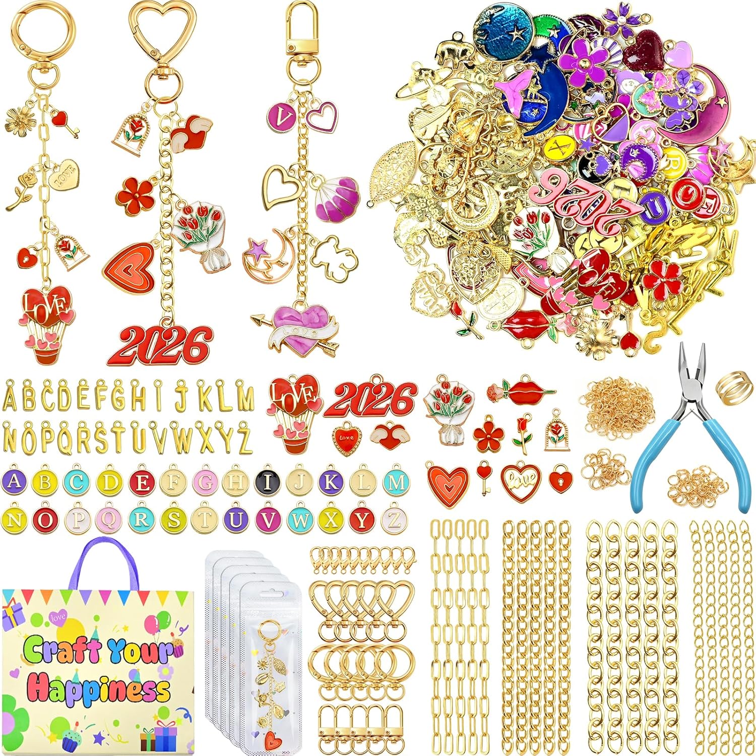 - 【375Pcs Ultimate Keychain Making Kit with Charms】 This keychain making kit with charms delivers everything needed to craft stunning personalized accessories! Includes 153 charms, 170 jump rings, 15 keychain clips, 20 extender chains, 10 lobster clasps, 5 heart storage bag, 1 jewelry plier, and 1 jump ring tool opener. Ideal for DIY keychain enthusiasts