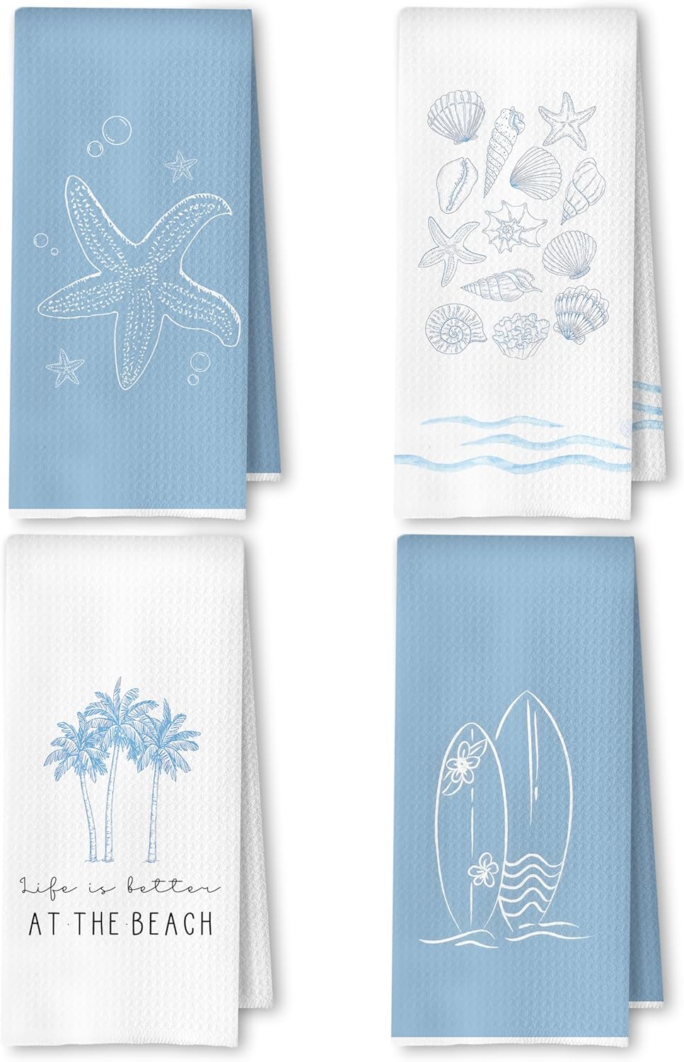 Retro Blue Coastal Beach Kitchen Towels, Tropical Palm Tree Seashell Surfboard Beach Hand Towels for Bathroom Decor, Coastal Nautical Dish Tea Towel for Kitchen, 16x24 Inches Set of 4