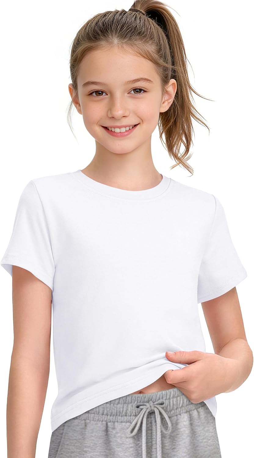 HASMES Girls Short Sleeve T Shirts Athletic Crewneck Crop Tops Basic Tees for Kids