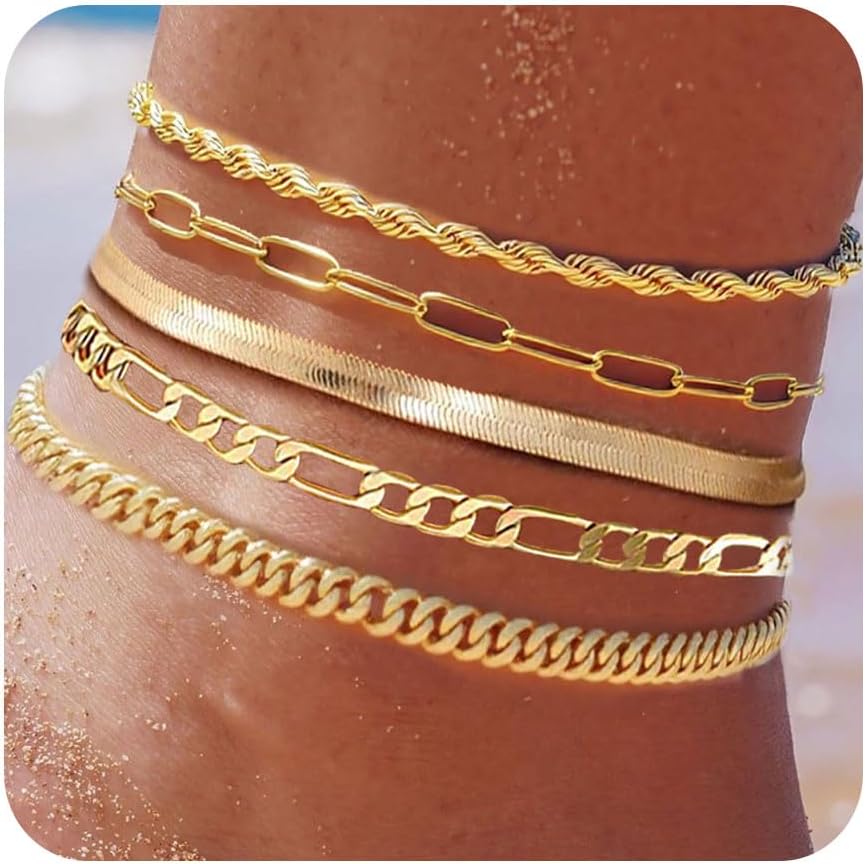 Plus Size Gold Ankle Bracelets for Women Big Ankles, Adjustable Ankle 14K Real Gold Plated Cuban Link Chain Figaro Snake Herringbone Extra Large Anklet Bracelets,Summer Beach Foot Jewelry 10-12inch
