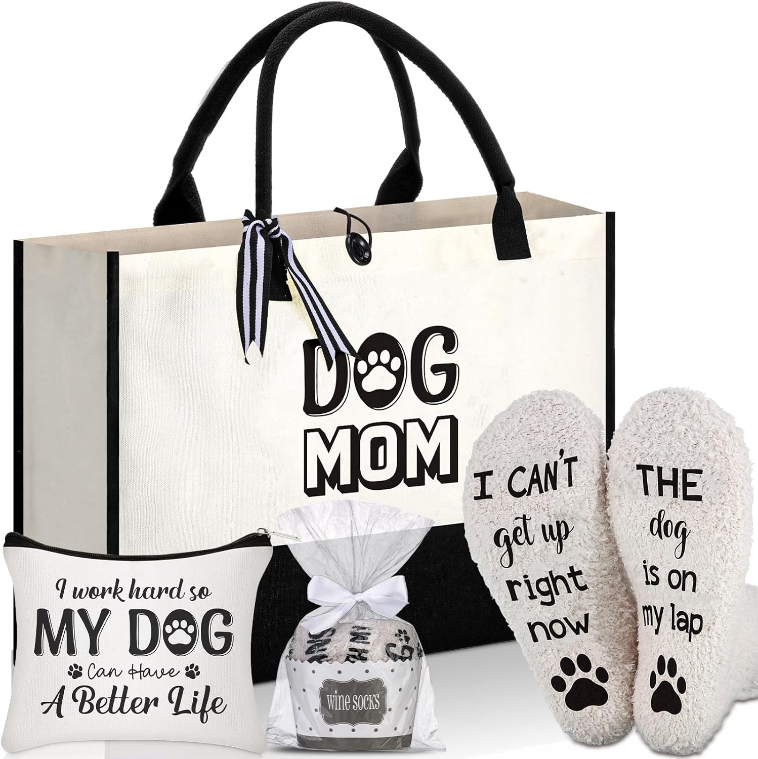 - Dog Themed Gift: this tote bag and makeup bag adopt dog theme design, specially designed for dog moms; The socks are also printed with dog related letter prints; This gift combination is both beautiful and reflects people's care and love for dogs; It is an ideal gift for mothers, wives, sisters, friends and any dog lovers