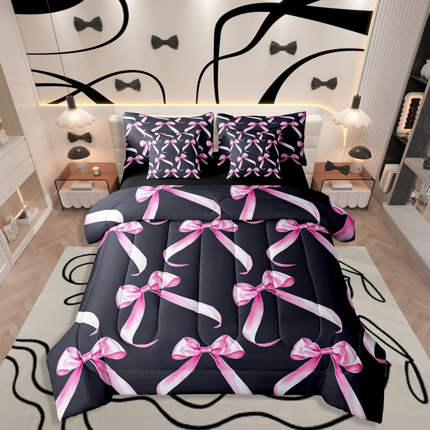 - Unique Design: This pink bow print comforter set will add a bright touch to your room. The pink bowknot bedding set has a white background with pink bows pattern, creating a vibrant and cute look. The matching sheets also feature cute pink bow knots pattern to coordinate with the pink bow comforter.