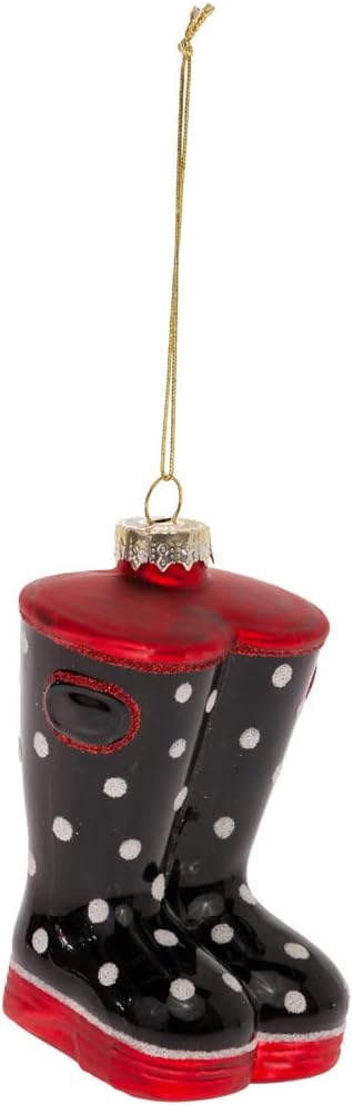 - MERRY FOR THE HOLIDAYS: Ornament looks like a pair of rain boots in black with white polka dots and red trim