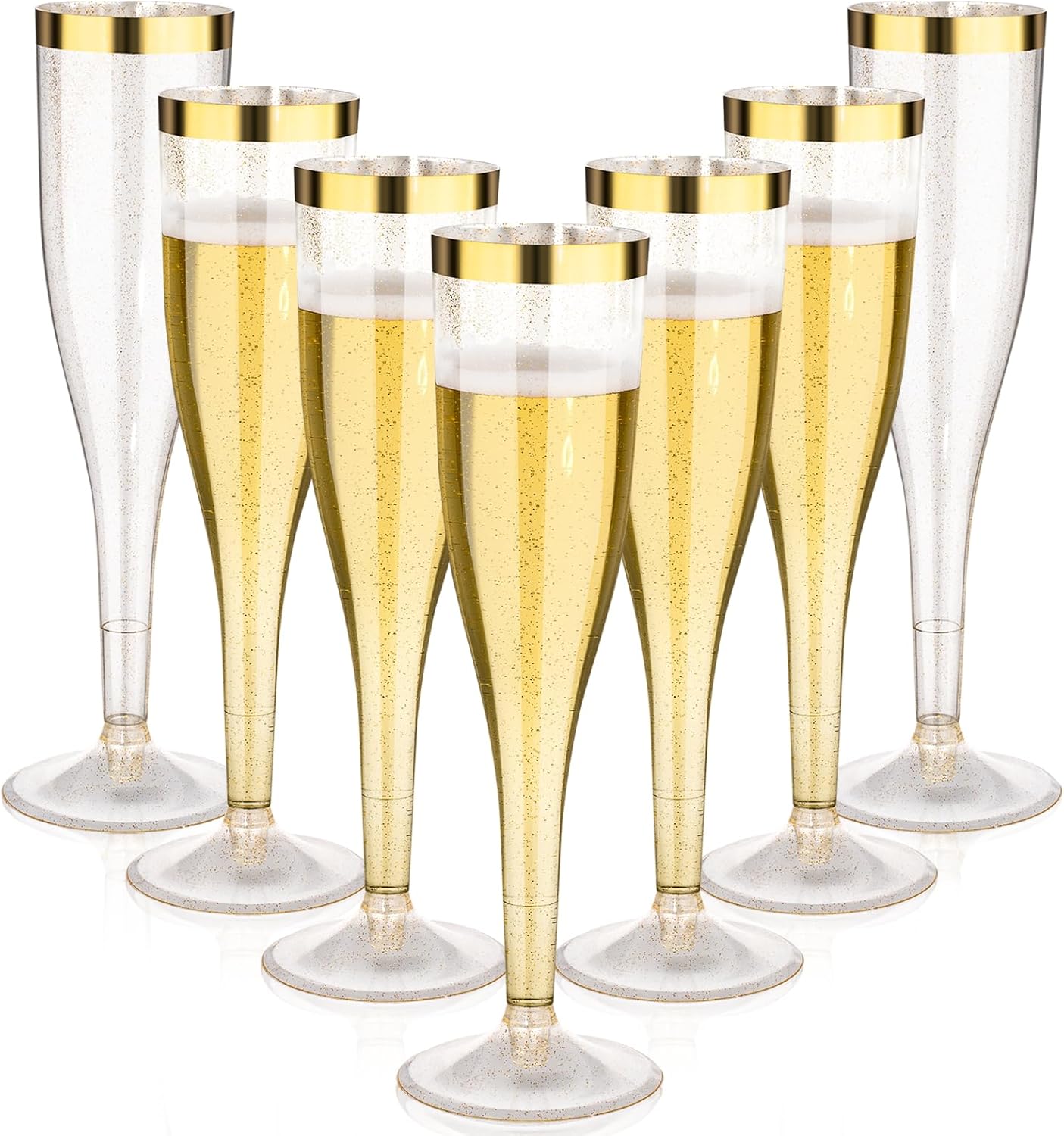 - Elegant Design: The Goodluck 6.5 oz plastic champagne flutes feature a stunning gold glitter design with gold rim; the shimmering gold details and elegant silhouette contribute a sense of luxury, making these flutes a luxurious addition to any celebration