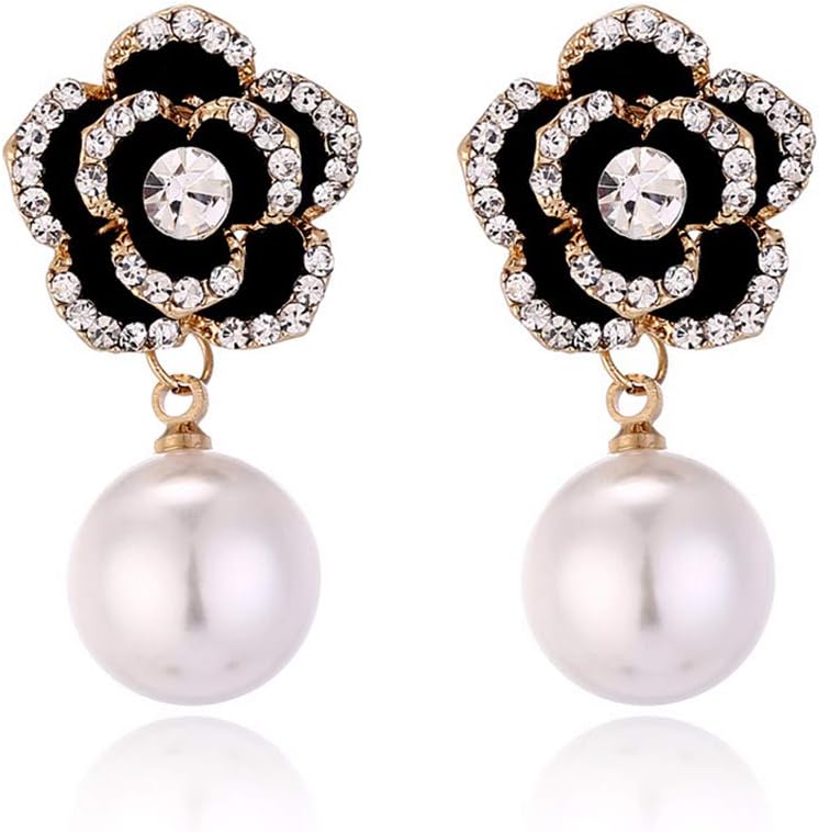 Women Imitation Pearl Rose Charm Dangle Drop Earrings