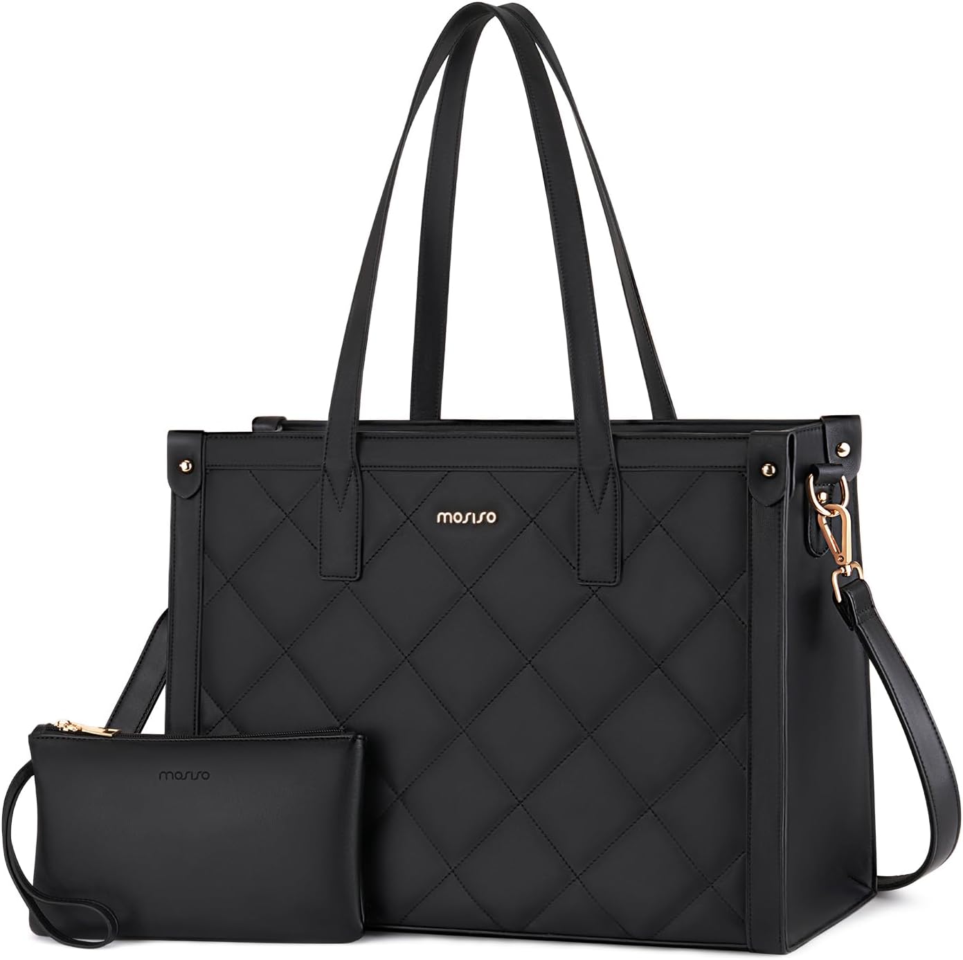 MOSISO Laptop Tote Bag for Women, 15.6 inch PU Leather Rhombus Quilted Work Bag with Cup Holder & Clutch Purse, Large Capacity Teacher Computer Briefcase for Business Office, Black